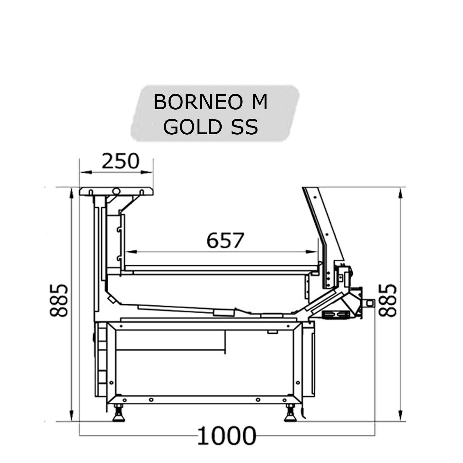 BORNEO model, which was designed for the display of deli meats, meats and various packaged products, offers a large stainless steel display surface, rich color options, ease of cleaning, capacity of placement and service of products and perfect ergonomics. Internal and external bends with rounded tempered glass provide the perfect display area that grabs attention in your store. It is at the forefront with its ergonomics and elegance as a perfect preference for supermarkets, hypermarkets and selected butchers. • Presentation in stainless steel whose level can be adjusted. • It allows easy cleaning thanks to its tempered glass which opens upwards. • Cooling with fan. • Possibility of self-service with the half glass option.